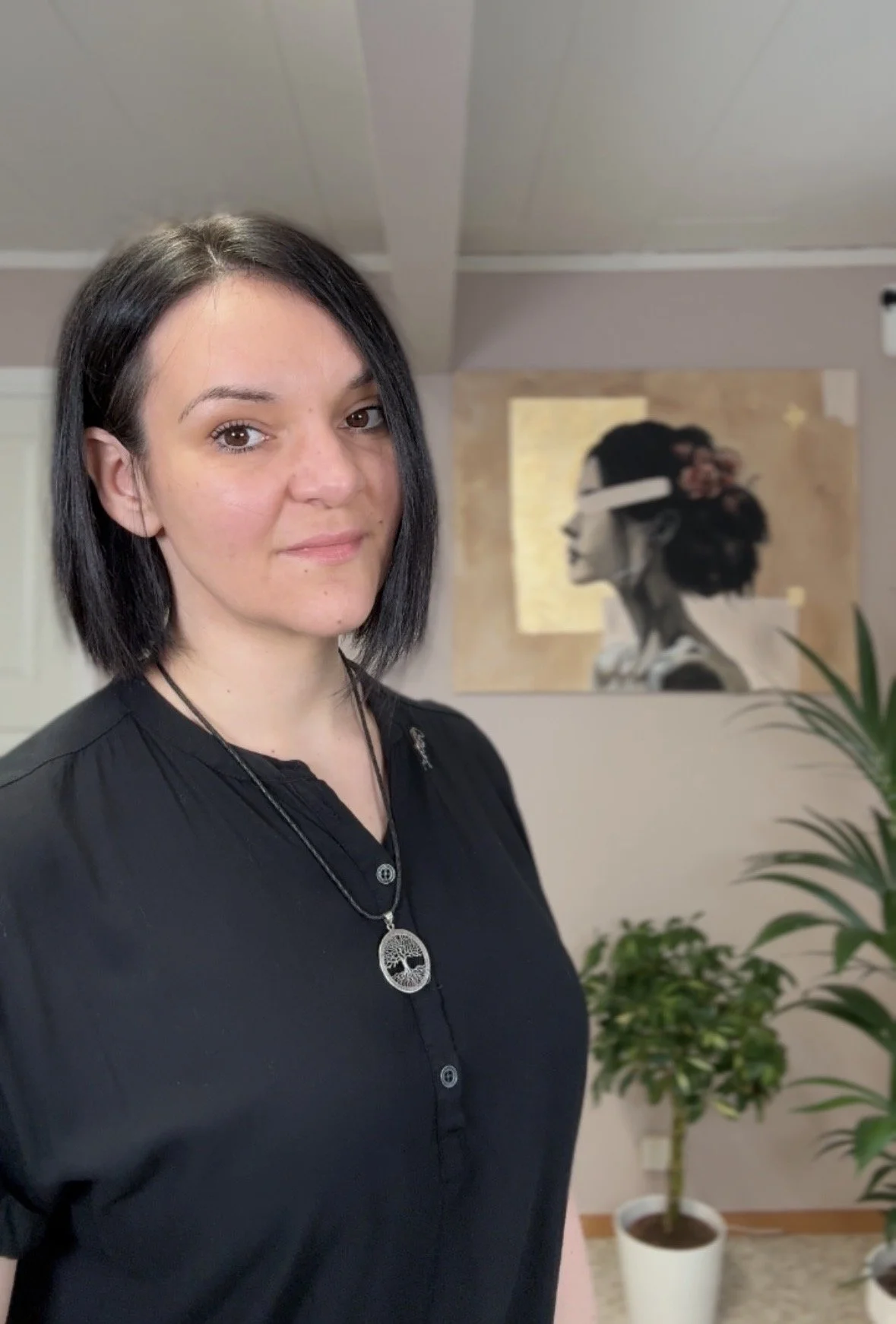 Siehst du das Gold hinter ihr? Es ist nicht gleichmäßig, nicht makellos, sondern ganz natürlich aufgetragen. Rau an den Rändern. Echt. Genau so, wie der Moment aussieht, in dem du endlich anfängst. Er muss nicht perfekt sein. Aber er ist Gold wert.